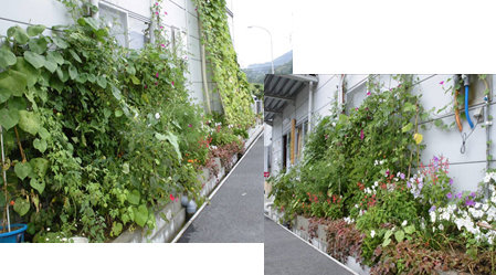 密集するように種類を多くして、見た目が華やかになる様にしました。朝は、「朝顔」、昼は「昼顔」、退社時は「夕顔」が楽しめます。
