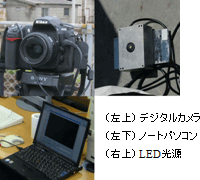 - システムは市販の高解像度デジタル一眼レフカメラ、画像解析用パソコンおよび測量標点となるLED光源から構成されます。