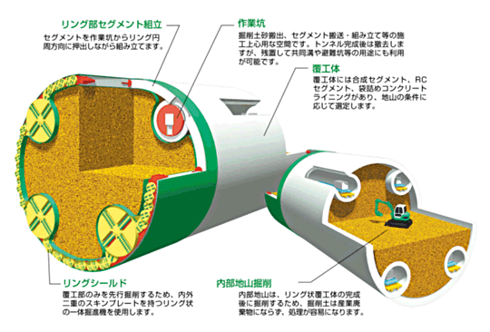 3. 環境負荷の低減:覆工部だけをシールド掘進するため、建設汚泥を低減できます。内部地山は普通土として取り扱うことができます。