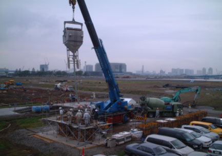 7) 今回取得した材料性能評価には、コンクリートを東京エスオーシー(株)芝浦工場での練混ぜ開始から150分以内に運搬を終了する、という条件がありますが、東京都心部のほぼ全域で使用することが可能です。また、コンクリート温度は40℃までを適用範囲としており、夏期施工にも無理なく対応が可能です。