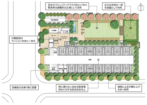また、外部に駐車場が配置されないため、敷地内にはこれまでにない広い空地を確保することが可能であり、その空地は普段は大規模で緑豊かなコミュニティスペースとして住民に開放されますが、緊急時には周辺住民を含めた避難防災広場として活用できます。